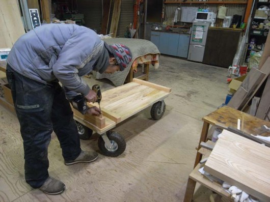k君は雪で遊ぶためのバギー・・・ではなくて台車を製作中。